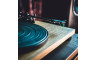 Двигатель постоянного тока с ремённым приводом и сенсорным контролем скорости исключает флуктуации вращения. Даже при длительном воспроизведении пластинки скорость остаётся стабильной, что минимизирует искажения и варьирования питча.