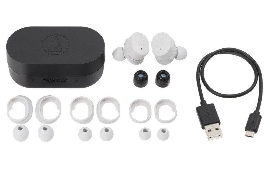 В дополнение к ушным вкладышам наушники поставляются со сменными ушными вкладышами четырех размеров (XS, S, M, L), одной парой ушных вкладышей Comply ™ из пены (M) с технологией SweatGuard ™ и USB-разъемом 30 см (1,0 '). зарядный кабель для зарядного чехла.
