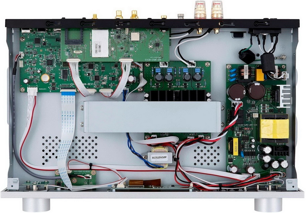 Встроенный усилитель мощностью 150 Вт обеспечивает чистое, динамичное и напористое звучание, раскрывающее потенциал любых полочных или напольных акустических систем. Сердцем цифровой части выступает референсный чип ЦАП Sabre32, отвечающий за детальное и музыкальное преобразование сигнала. Работу всего устройства поддерживает быстрый и стабильный двухъядерный процессор ARM Cortex A9 с частотой 1,0 ГГц, что позволяет обрабатывать даже самые ресурсоёмкие задачи без задержек.