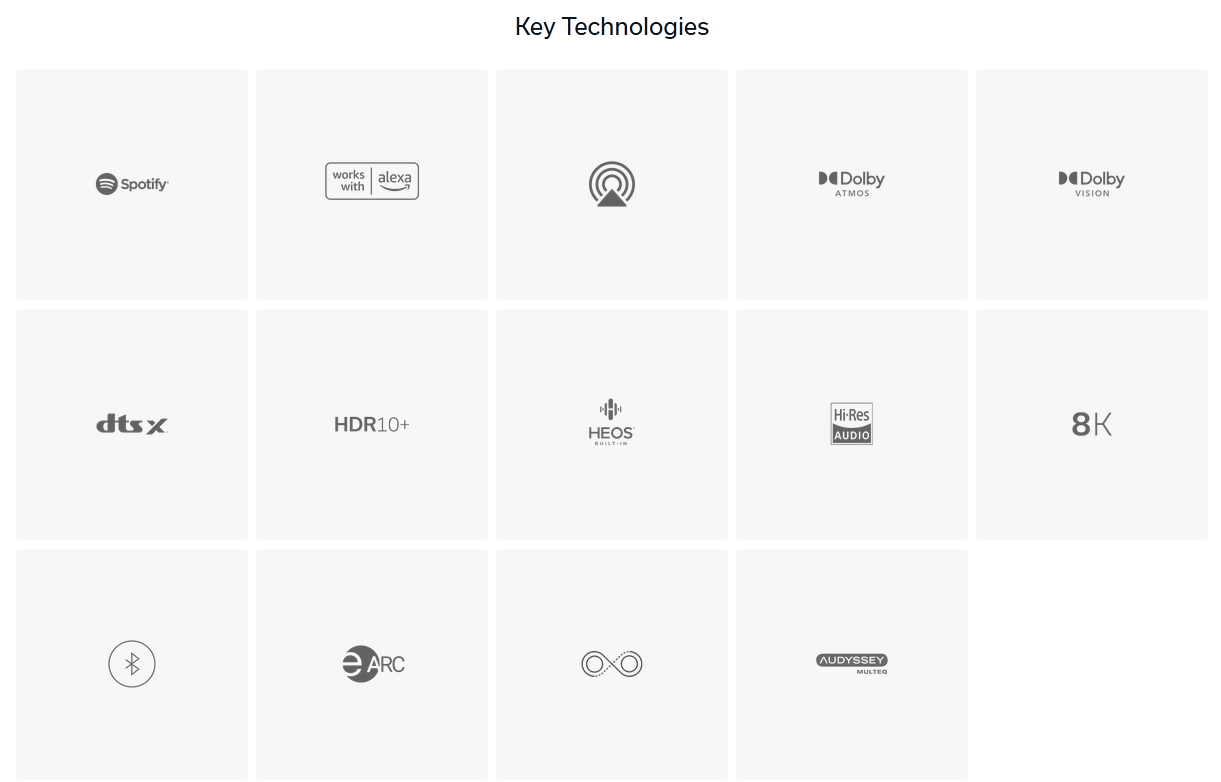 Встроенные декодеры Dolby Atmos и DTS:X создают объёмную акустическую сцену с реалистичным позиционированием источников. Поддержка 8K-видео позволяет использовать ресивер как центральный элемент системы, работающей с современными источниками сигнала. Высокоточный ЦАП и схемы коррекции Audyssey MultEQ XT обеспечивают точное согласование каналов и адаптацию под конкретное помещение.