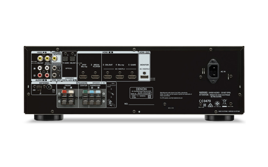 Denon AVR-X520BT - это AV-ресивер, который оснащен многими современными функциями и обладает высококачественными производительными характеристиками при своей невысокой стоимости. Ресивер обеспечивает хорошее звучание и поддерживает последние спецификации HDMI, вместе с последней версией HDCP 2.2, которая требуется при воспроизведении контента 4K/UltraHD. Аппарат имеет 5 входов HDMI, три из которых поддерживают трансляцию сигналов 4K/Ultra HD с частотой кадров 60 Гц и 4:4:4 Pure Color для максимальных возможностей ДК.