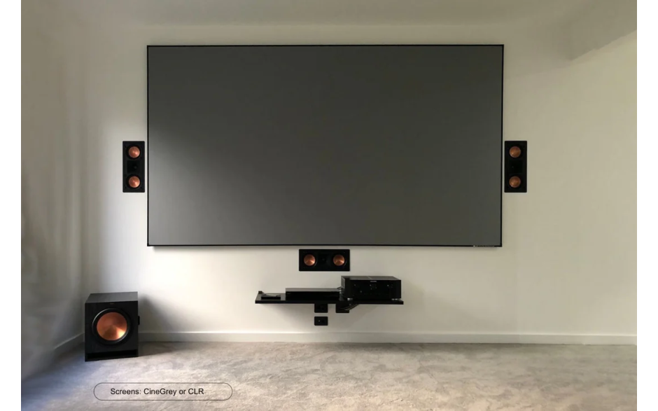 Тыльная сторона полотна выполнена в чёрном цвете, что эффективно блокирует проходящий свет, обеспечивая точную цветопередачу и глубокие чёрные оттенки. Прочный корпус экрана делает конструкцию устойчивой и долговечной, а использование технологии CineGrey помогает минимизировать влияние внешней засветки, улучшая восприятие изображения при использовании мощного проектора.