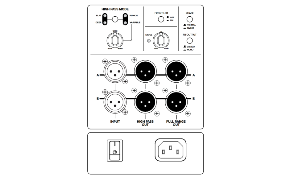 - Переключатель полярности — помогает устранить фазовые конфликты в сложных звуковых системах.