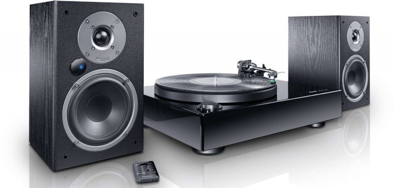 Интегрированная электронная система принимает сигналы Bluetooth и оснащена цифровыми и аналоговыми входами. Непосредственно к входу RCA также может быть подключен проигрыватель пластинок со звукоснимателем MM, при этом дополнительный фонокорректор не требуется. Прилагаемый пульт дистанционного управления используется для выбора входа и регулировки громкости.