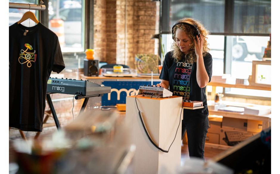 - Цветной спектр радуги с логотипом Moog визуально подчёркивает связь с музыкальной культурой.