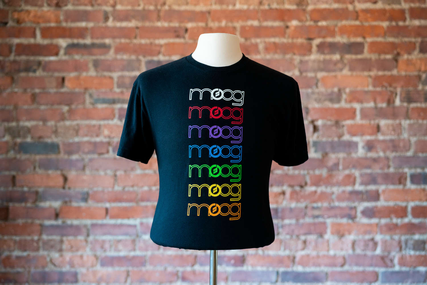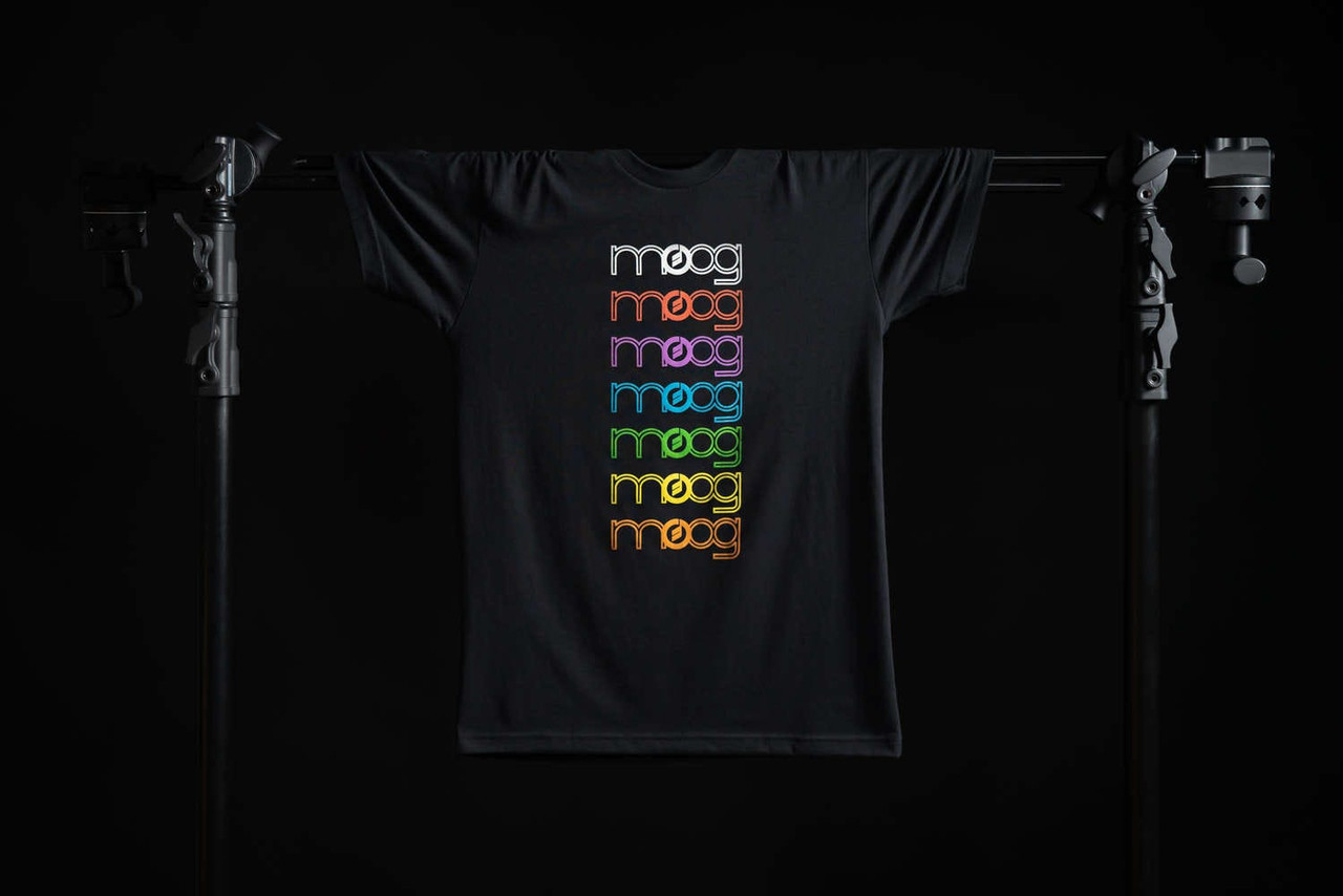 Дизайн футболки вдохновлен визуальной эстетикой аналоговых синтезаторов. Цветной спектр радуги символизирует гармонический диапазон электронного звучания, а логотип Moog добавляет фирменный акцент.