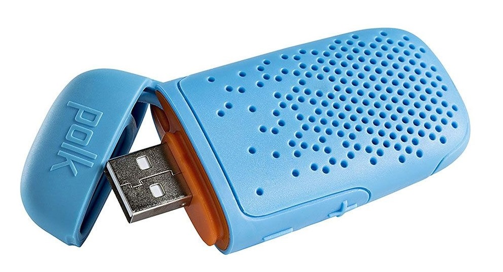 Компактная Bluetooth-колонка Polk Audio Boom Bit оснащена металлической клипсой-держателем и ее можно закрепить в удобном месте на одежде.
