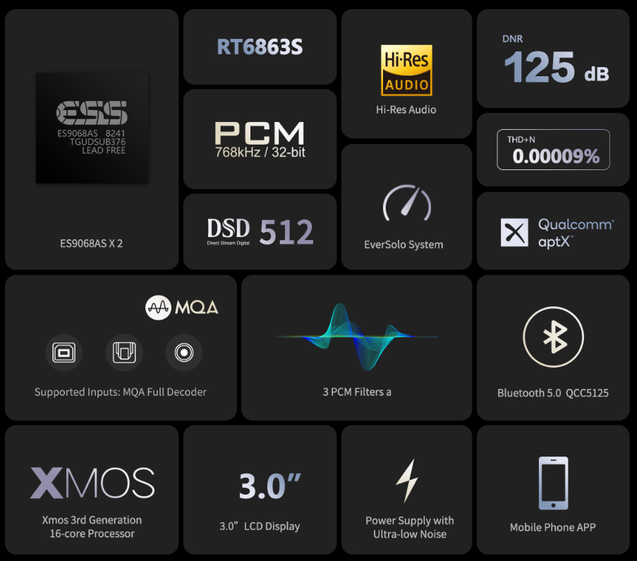 EverSolo DAC-Z6 - це потужний продуктивний настільний ЦАП, заснований на ретельно розробленій архітектурі. Він використовує два чіпи від ESS та високоякісні компоненти в обв'язці, а також інтерфейс XMOS 316 для підключення, що дозволяє працювати із записами у різних форматах, включаючи MQA.