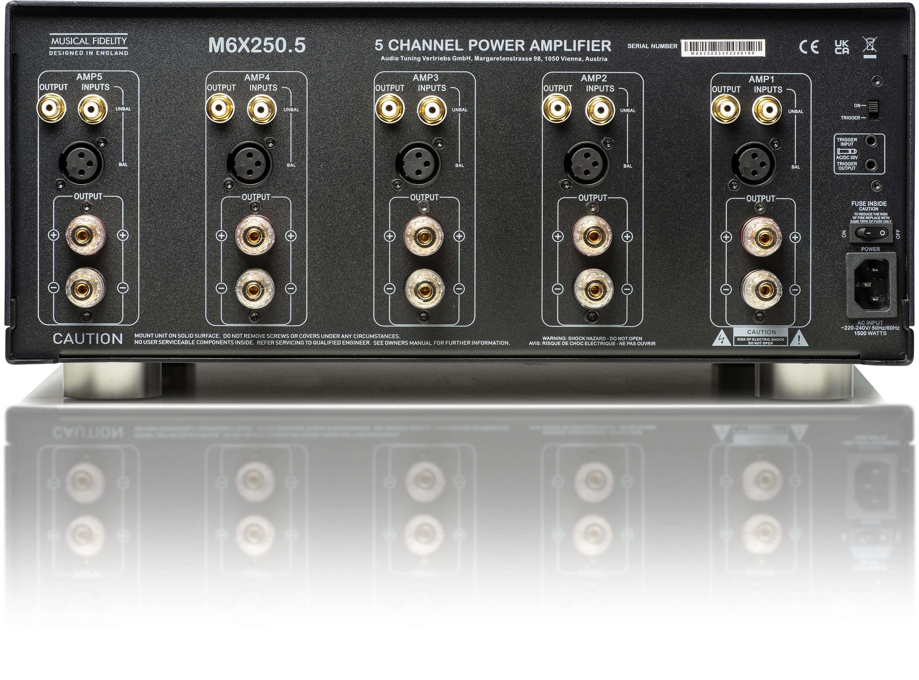 M6x 250.5 – семиканальний підсилювач потужності, що має модульну конструкцію. Кожен модуль підсилювача видає 250 Вт на завантаженні 4 Ом і працює у класі АВ. Створюючи підсилювачі, Musical Fidelity прагне забезпечити максимально натуральне та природне звучання, що зберігає транзієнти, найдрібніші деталі та відтінки. Малошумні аудіофільські трансформатори живлення забезпечують схеми чистою енергією, не обмежуючи динаміку звучання та допомагаючи формувати об'ємну звукову сцену. Обидві характеристики є виключно важливими для підсилювача, який використовується в домашньому кінотеатрі.