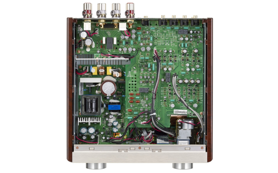 По своей конструкции интегральный стерео усилитель Marantz HD-AMP1 похож на внешний ЦАП HD DAC1 и соответствует топовым моделям компании, что подчеркивает и его внешнее оформление. Металлический корпус с толстой передней панелью из алюминия имеет декоративные боковые стенки из натурального дерева и установлен на антирезонансных опорах. Усилитель оснащен узнаваемым круглым дисплеем, на который выводится информация об основных режимах работы и двумя поворотными рукоятками, одна из которых переключает источники сигнала, а другая регулирует громкость. |