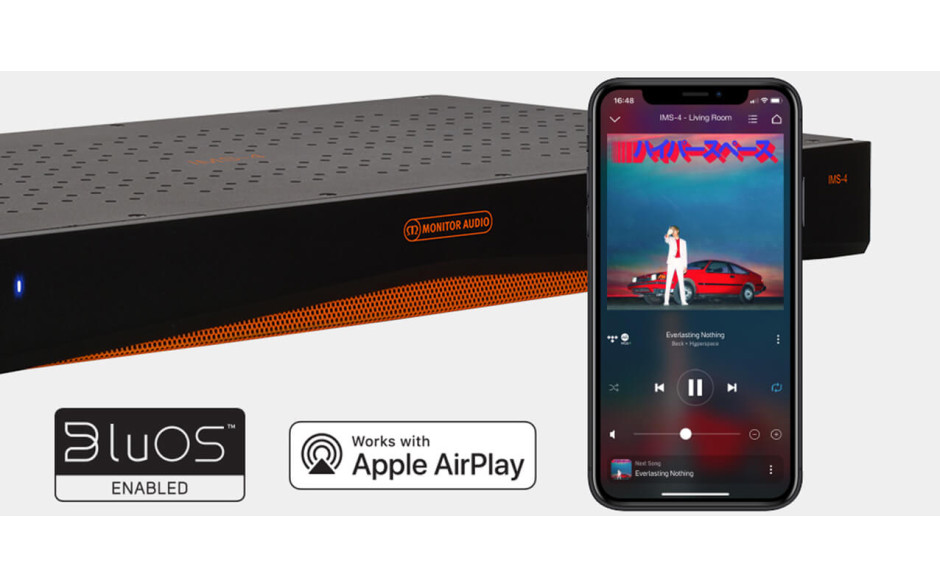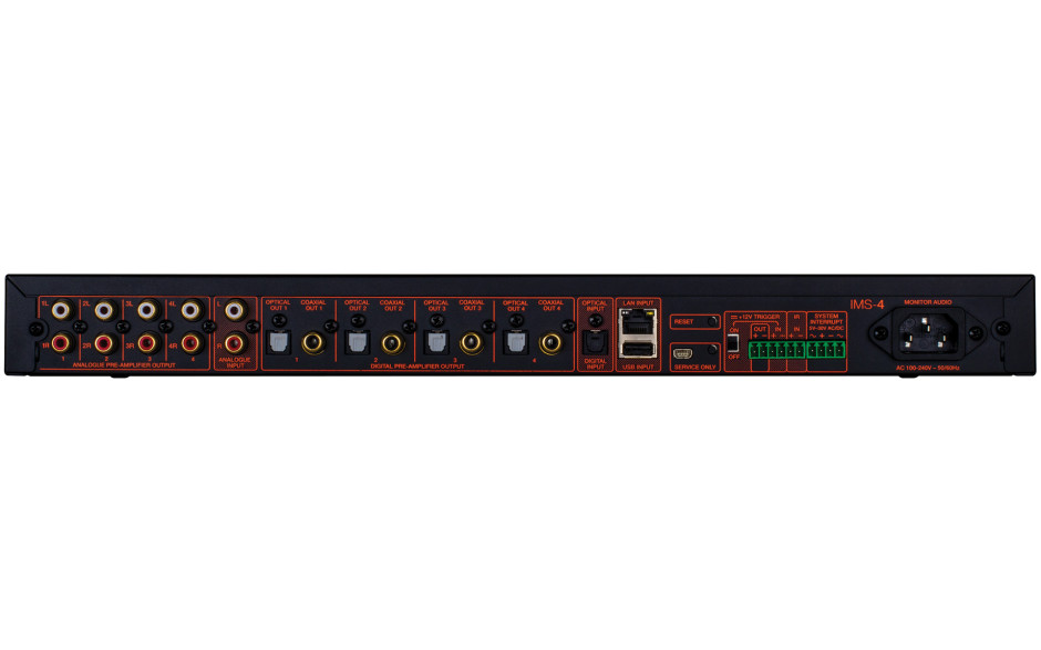 Monitor Audio IMS-4 рассчитан на независимое озвучивание четырех зон, сигнал на которые может быть снят с аналоговых или цифровых (оптических или коаксиальных) выходов. Аппарат построен на базе программного обеспечения BluOS, с помощью которого можно воспроизводить музыку с доступных сетевых устройств, а также с помощью популярных онлайн-сервисов. Для управления работой системы можно использовать удобное мобильное приложение или голосовых помощников Alexa и Google. Кроме того, Monitor Audio IMS-4 интегрируется в инсталлированные системы под управлением Crestron, Control4 и RTI. На задней панели устройства имеются триггерные вход и выход, и вход для внешнего ИК-датчика. Здесь же находятся входы для прерывания звучания музыки в случае появления в системе голосового сообщения.