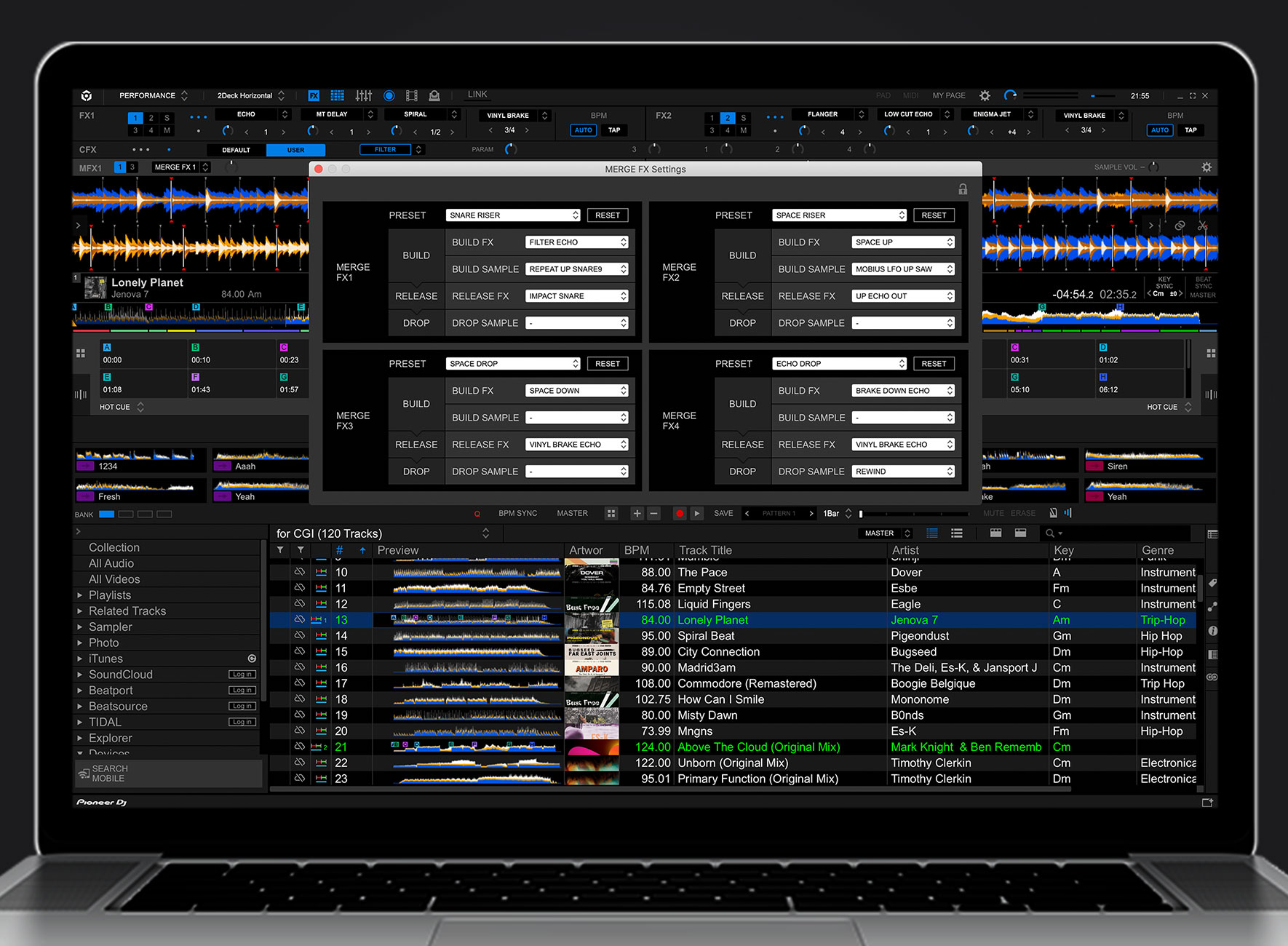 У новому розділі Merge FX у rekordbox (ПК/Mac) ви можете налаштувати кожен тип ефекту та семпли, що використовуються у кожному патерні, для створення власних варіацій. Виберіть з 41 типу ефекту для кожного елемента (Build FX, Build Sample, Release FX та Drop Sample) та комбінуйте їх, щоб створити більше 9000 різних патернів.