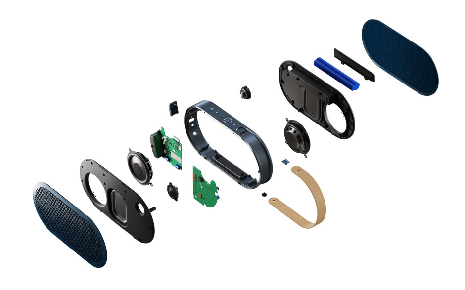 Всю передню та задню панелі АС закривають захисні сітки з оригінальним малюнком, за якими ховається двосмугова акустика – по одному НЧ-динаміку діаметром 3,5 дюйма та 21 мм пищалці з кожного боку. Кожен з цих динаміків був спеціально розроблений для використання вДАЛЬШЕ УКАЧ, так як їх було необхідно вбудувати в корпус невеликої глибини, не втративши при цьому як звук. НЧ-динаміки оснащені інвертованим алюмінієвим дифузором, робочий хід якого завдяки спеціальним конструктивним рішенням вдалося зробити таким же, як і у низькочастотних динаміків у традиційній Hi-Fi-акустиці. Колонка комплектується симпатичним ремінцем для перенесення.